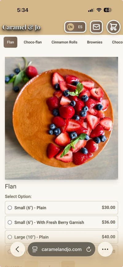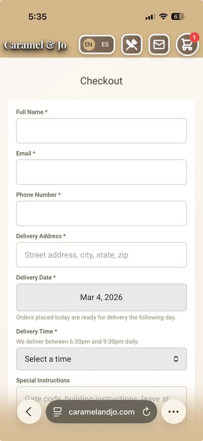Custom e-commerce web app built to feel native on mobile. Next.js, responsive design, bilingual (EN/ES) support, and SEO-optimized structure. Warm brand palette and high-contrast product photography drive conversion.